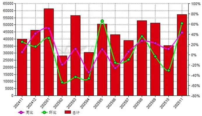 2025年11月份中國電熔鎂砂出口量57,302.92公噸,去年同期為39,937.91公噸,上月為35,481.07公噸,同比上漲43.48%,環(huán)比上漲61.50%。