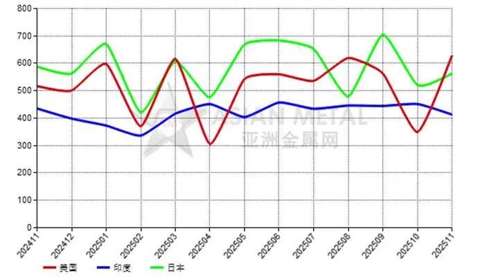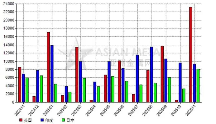 2025年11月,中國電熔鎂砂前三大出口目的國為美國、印度和日本。