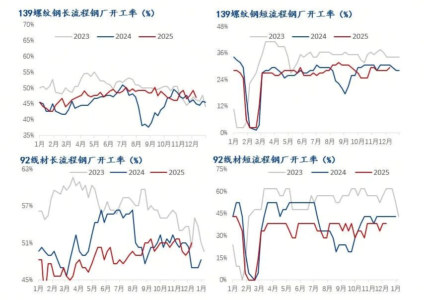 截止12月底,全國建筑鋼材鋼廠螺紋鋼和線材開工率環(huán)比均有一定下降。12月25日,螺紋鋼開工率為38.56%,較上月下降3.27個(gè)百分點(diǎn),線材開工率42.44%,較上月下降6.4個(gè)百分點(diǎn)。分工藝來看,長流程企業(yè)螺紋鋼開工率環(huán)比下降3.65個(gè)百分點(diǎn),長流程線材開工率下降6.71個(gè)百分點(diǎn);短流程螺紋鋼開工率環(huán)比下降2.35個(gè)百分點(diǎn),短流程線材開工率環(huán)比下降4.76個(gè)百分點(diǎn)。