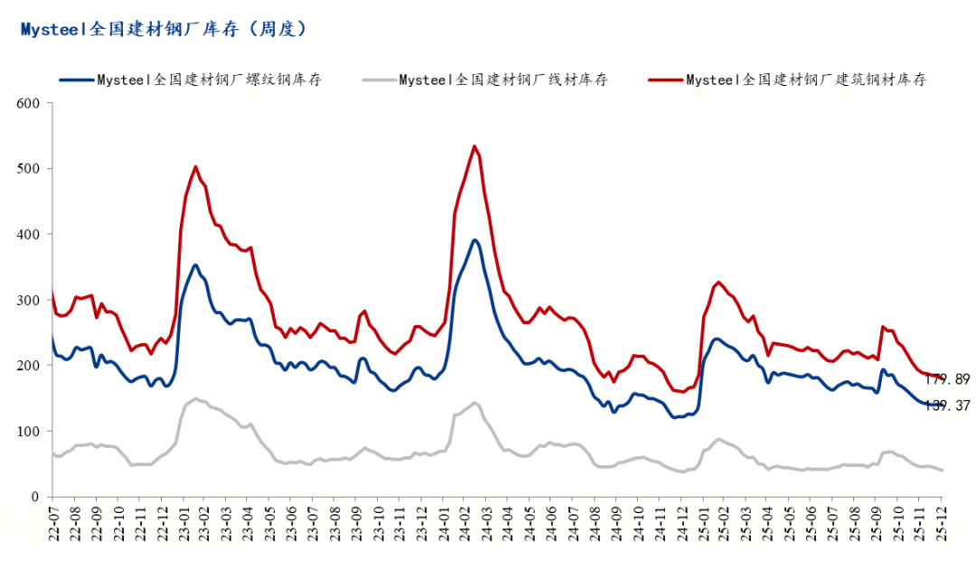 截止12月26日,Mysteel統(tǒng)計(jì)建筑鋼材139家鋼廠螺紋鋼庫存總量為140.06萬噸,月環(huán)比下降6.67萬噸,同比增加18.53萬噸;92家鋼廠線材庫存43.32萬噸,月環(huán)比下降3.34萬噸,年同比增加4.1萬噸。