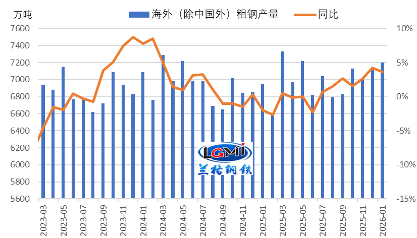 全球粗鋼供給端穩(wěn)步擴張,持續(xù)分流我國鋼材出口份額。世界鋼協(xié)數(shù)據(jù)顯示,2026年1月,全球69個納入統(tǒng)計的國家和地區(qū)粗鋼產(chǎn)量為1.473億噸,同比下降6.5%。