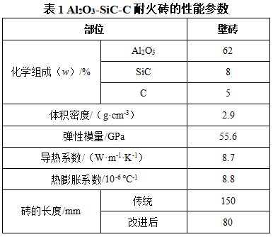福山區(qū)2#煉鋼廠的鐵水包主要承接高爐鐵水,并通過機械攪拌脫硫后,轉(zhuǎn)移到煉鋼轉(zhuǎn)爐進行冶煉。鐵水包上部空置區(qū)域的包璧不與鐵水直接接觸,僅遭受鐵水熱輻射作用,通常采用氧化鋁質(zhì)耐火材料,渣線及下部區(qū)域與包底遭受侵蝕較嚴(yán)重,主要采用Al2O3-SiC-C耐火磚,性能見表1。鐵水包損毀主要是由工作襯剝落(包括熱剝落、結(jié)構(gòu)剝落及機械剝落)導(dǎo)致的,其中剝落嚴(yán)重的部位在工作襯側(cè)壁,反復(fù)的熱膨脹導(dǎo)致耐火磚出現(xiàn)裂紋,引起襯磚的脫落,常需要進行修補。