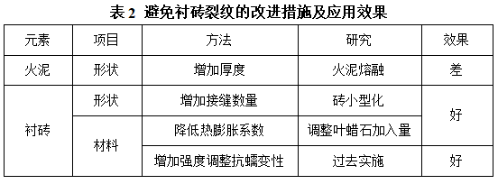 通過分析襯磚損毀機理,采取相應(yīng)改進措施,見表2,并進行相應(yīng)的應(yīng)用效果評估。通過改進火泥及耐火磚參數(shù)來降低襯磚服役過程中產(chǎn)生的應(yīng)力集中度??梢钥闯?,由于火泥的耐用性不如耐火磚,因此增加火泥厚度達不到預(yù)期效果。減小耐火磚的尺寸后(磚長由150 mm減小為80 mm),火泥接縫數(shù)量增加。通過模擬計算承接高溫鐵水時磚縫增加前后磚中應(yīng)力值對比可知,磚縫增加后,磚中最大主應(yīng)力指數(shù)下降50%,最小主應(yīng)力指數(shù)下降30%,應(yīng)力分布更均勻,可有效避免磚中裂紋的產(chǎn)生。