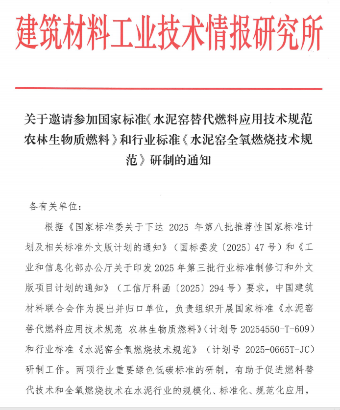 國標(biāo)《水泥窯替代燃料應(yīng)用技術(shù)規(guī)范農(nóng)林生物質(zhì)燃料》及行標(biāo)《水泥窯全氧燃燒技術(shù)規(guī)范》參編邀請